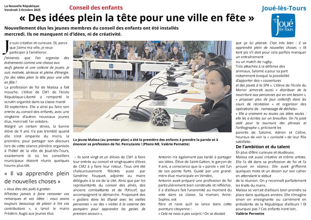 La campagne électorale a eu lieu dans les dix écoles élémentaires de Joué-lès-Tours du 22 au 29 septembre 2025 pour élire les nouveaux membres du Conseil parmi les élèves de CM1. L’élection quant à elle, s’est déroulée le mardi 30 septembre avec la proclamation des résultats le mercredi 1er octobre lors de la Plénière d’Installation du Conseil.
