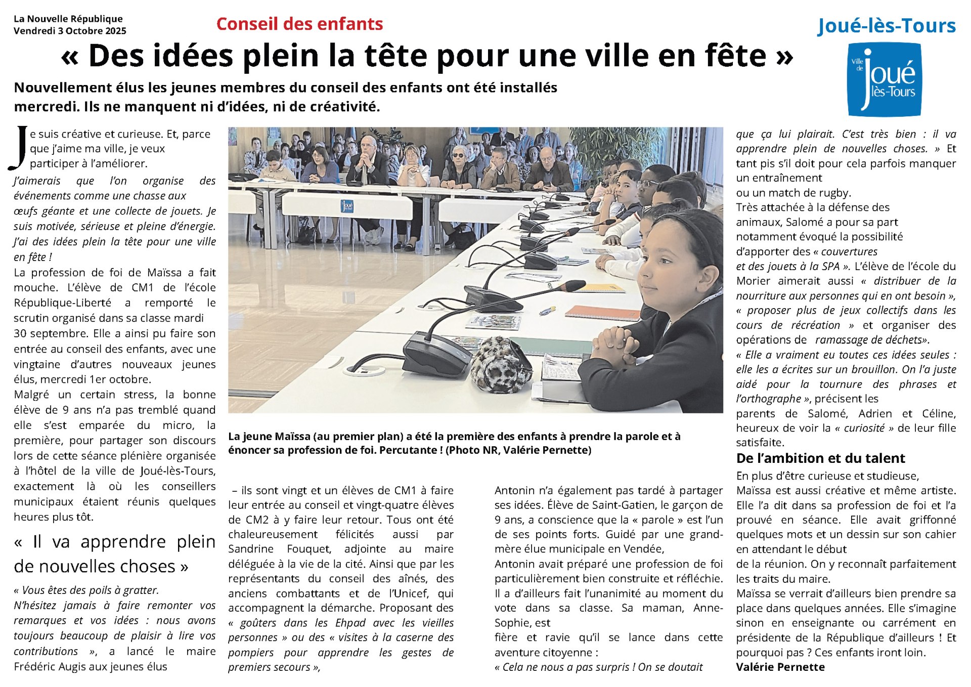 La campagne électorale a eu lieu dans les dix écoles élémentaires de Joué-lès-Tours du 22 au 29 septembre 2025 pour élire les nouveaux membres du Conseil parmi les élèves de CM1. L’élection quant à elle, s’est déroulée le mardi 30 septembre avec la proclamation des résultats le mercredi 1er octobre lors de la Plénière d’Installation du Conseil.