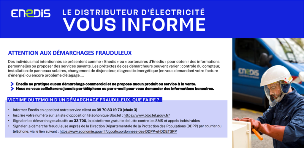 Depuis plusieurs jours, Enedis reçoit des signalements de clients faisant état d’une nouvelle vague d’opérations de démarchage illégales entreprises notamment depuis des plates-formes téléphoniques. Les auteurs de ces pratiques se font passer pour des partenaires d’Enedis ou pour Enedis, et ce, dans le but de proposer des offres commerciales ou d’obtenir des informations personnelles. Enedis condamne avec la plus grande fermeté ces agissements graves et répréhensibles et souligne que ces faits sont de nature à être sanctionnés pénalement.