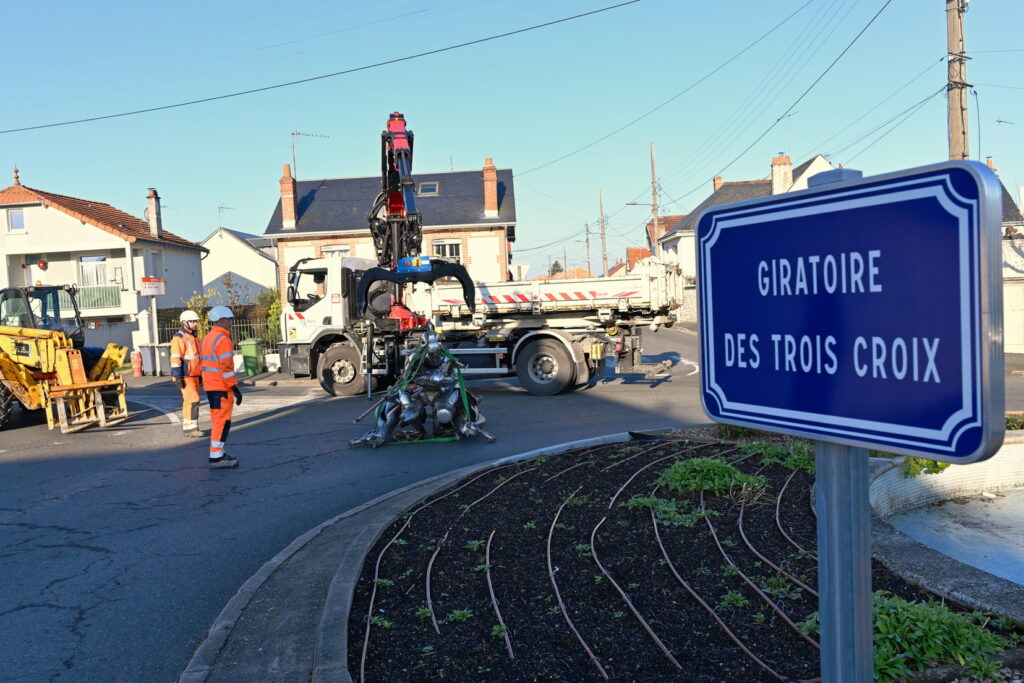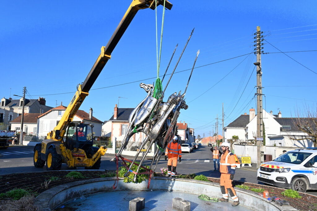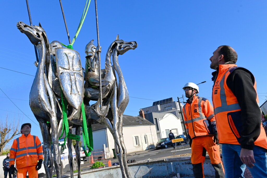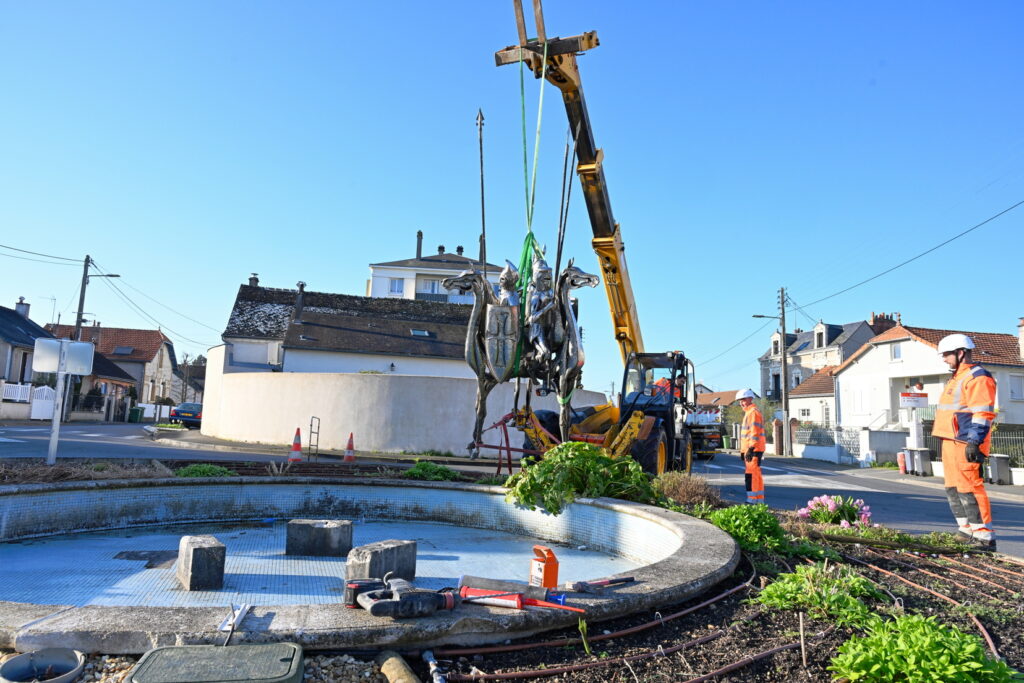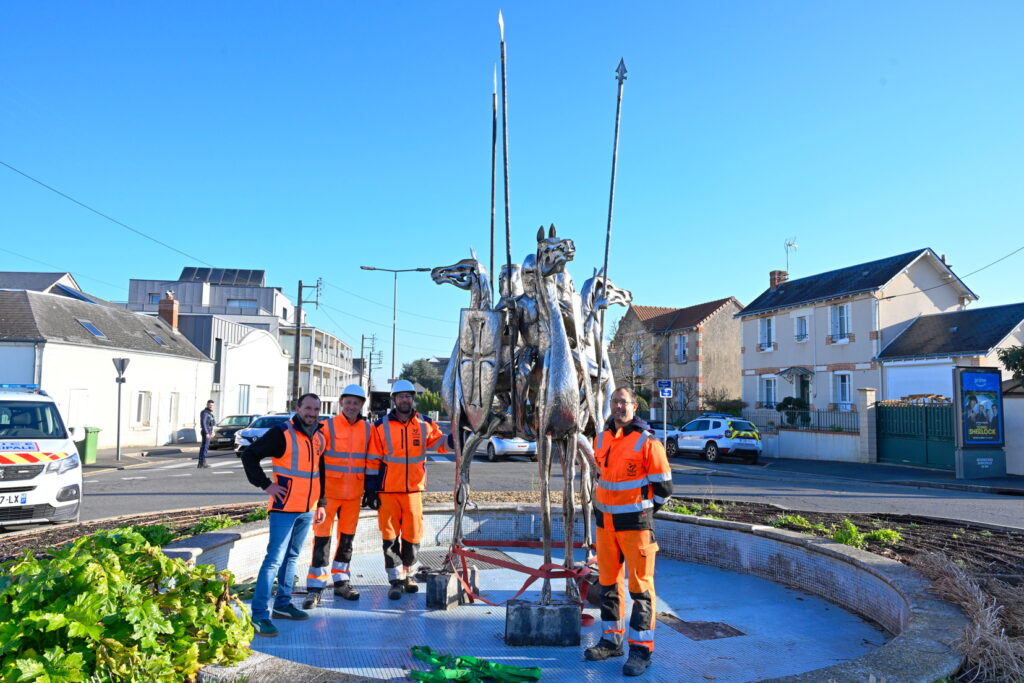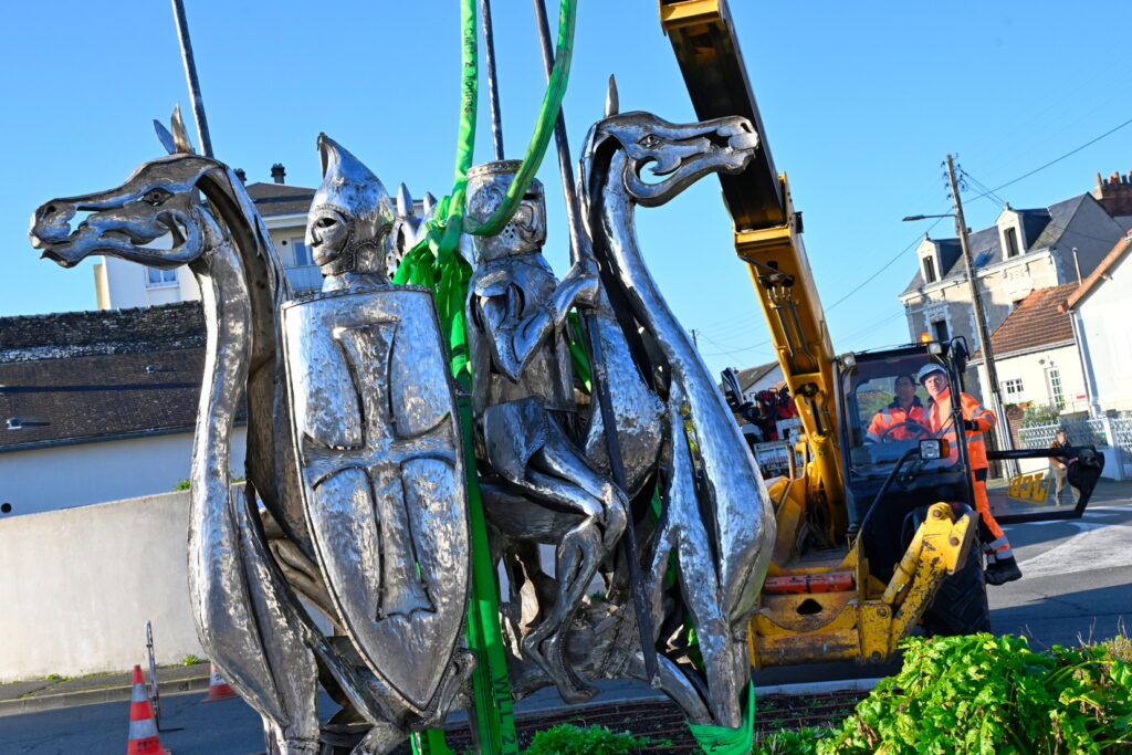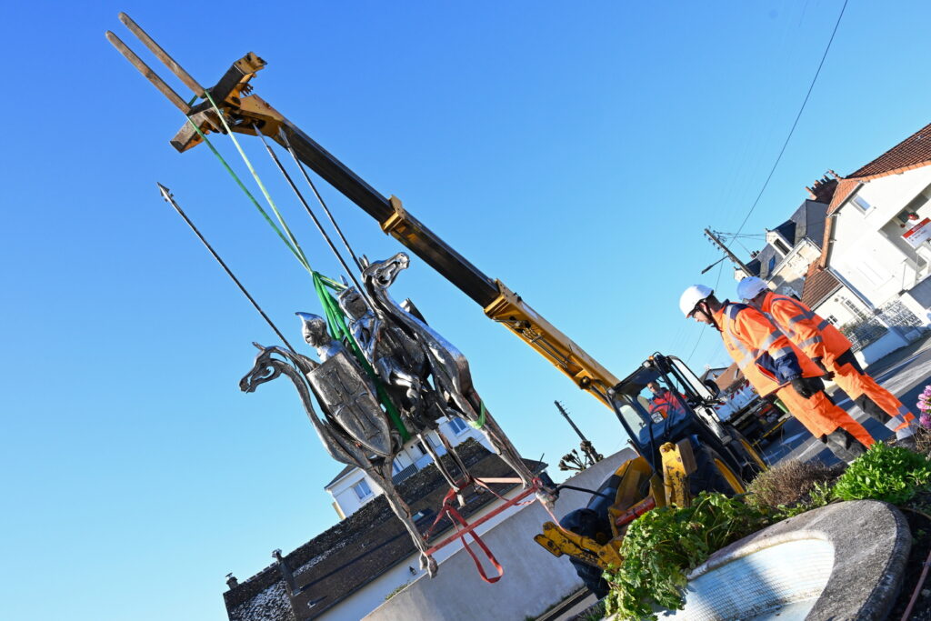 L’œuvre des trois cavaliers qui étaient situés sur le rond-point des Trois Croix a été installée ce matin !