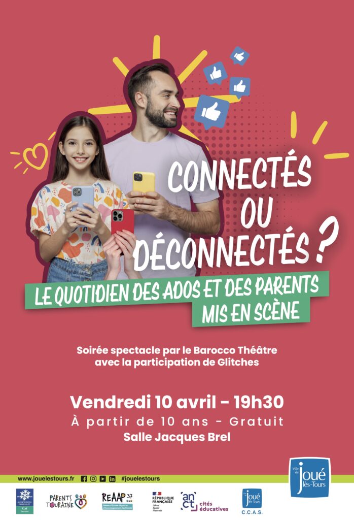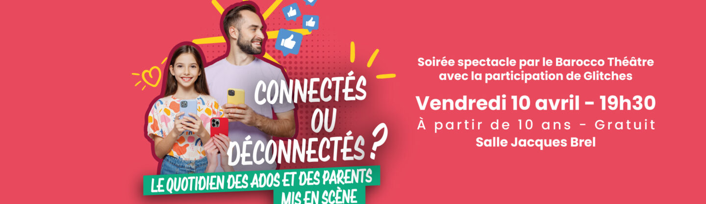 La Ville organise un temps fort, vendredi 10 avril avec « Connectés ou déconnectés ? » Le quotidien mis en scène, une soirée Parents Ados, accessible dès 10 ans. Découvrez la réalisation par Glitches et le Barroco Théâtre de scénettes illustratives de vie quotidienne, salle Jacques Brel dès 19h30.