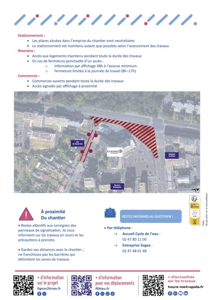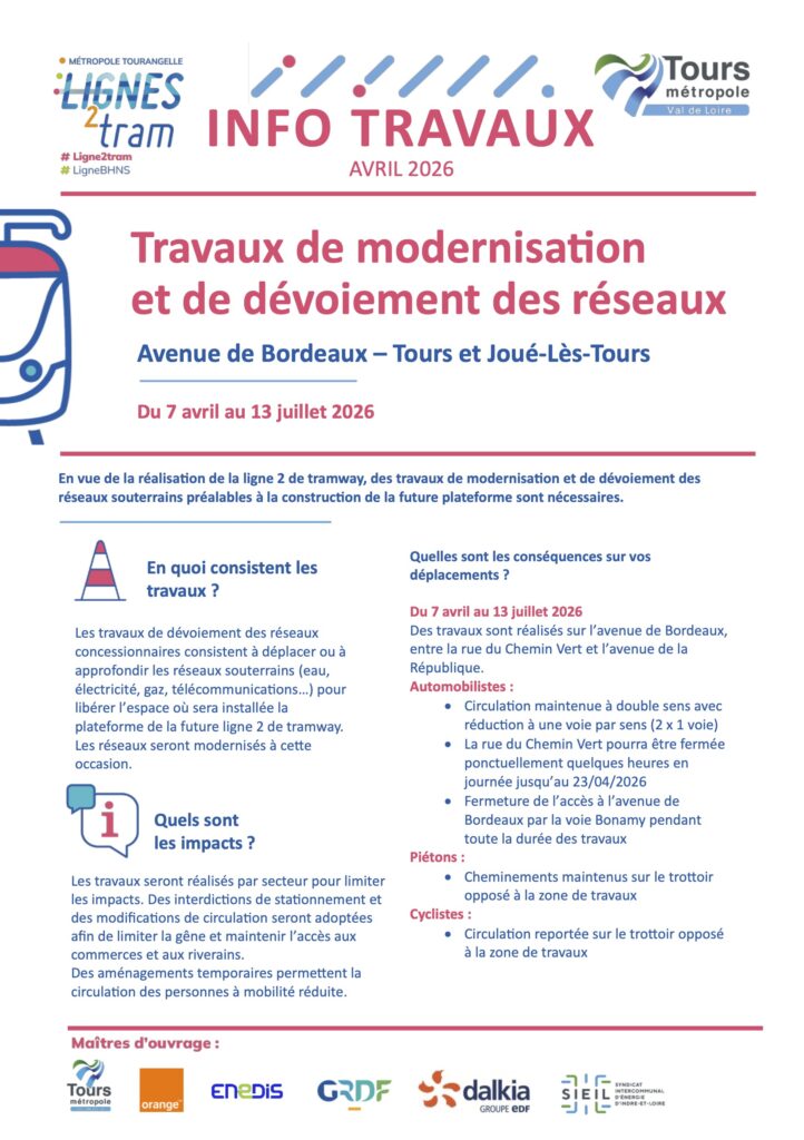 En vue de la réalisation de la ligne 2 de tramway, des travaux de modernisation et de dévoiement des réseaux souterrains préalables à la construction de la future plateforme sont nécessaires. Des perturbations sont donc à prévoir Avenue de Bordeaux à Tours et Joué-lès-Tours jusqu’au 13 juillet 2026.
